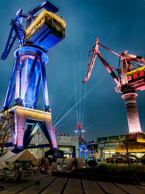 Colorful night view of towering illuminated cranes in Shanghai, China, with vibrant lights and urban backdrop.