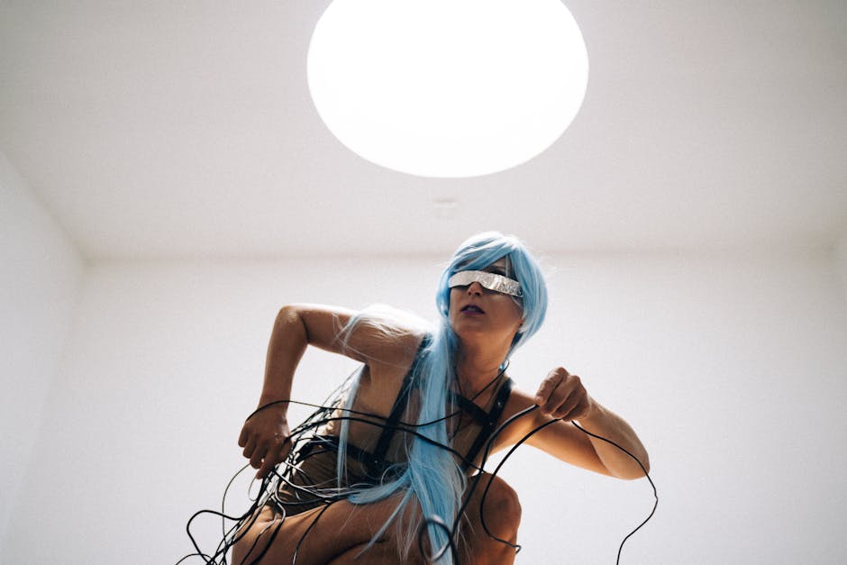 A striking pose of a woman in futuristic cyberpunk attire and blue hair in a minimalistic room.