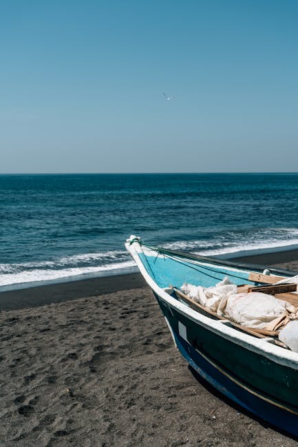 A peaceful beach with a colorful boat resting on the sandy shore under a clear blue sky.