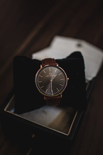Close-up of a sophisticated brown leather watch presented in a stylish gift box, perfect for fashion and luxury themes.